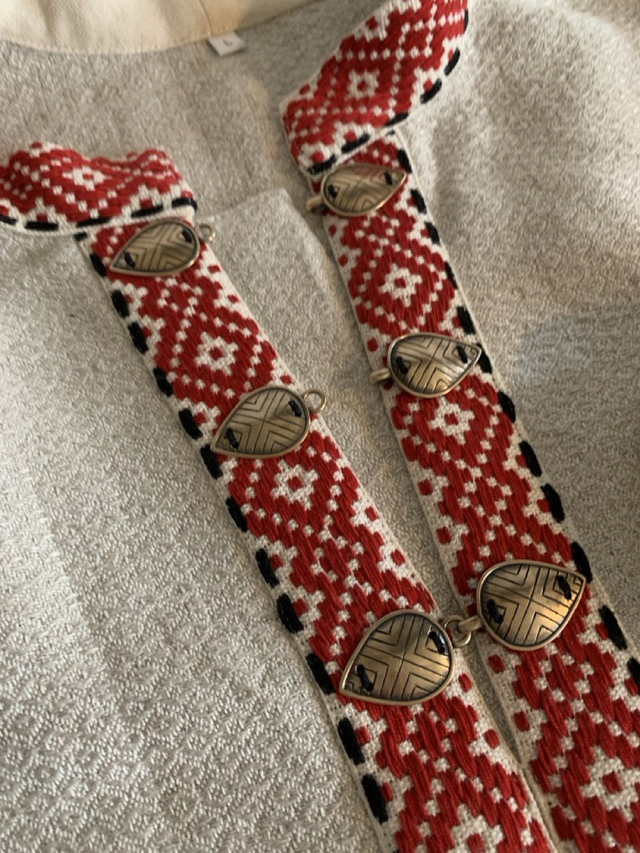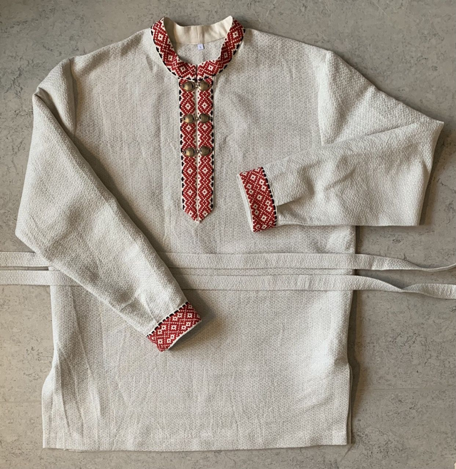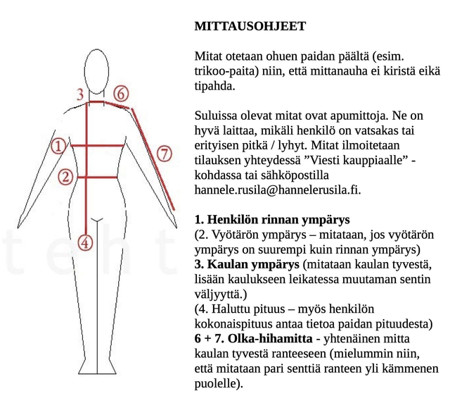 Karjalaishenkinen paita pellava-puuvillakankaasta. Kangas on kudottu Hämeenlinnassa Tekstiiliverstaalla ja se on kutistettu pesemällä kaksi kertaa. Koristenauha on kudottu käsin ja kuviolangan materiaali on puuvilla, myös se on kutistettu. Paitoja saatavilla XXS - XXXXL -kokoisina joko tinaisilla sydänsoljilla tai pronssisilla suomalaisilla soljilla, jotka on valmistanut MYK Jewel. Pesu käsin tai 40-60 asteen hienopesussa nurin käännettynä. Höyrytys tai silitys kosteana kolmen pisteen lämmöllä. Pesussa pellavasta voi tarttua nöyhtää muuhun pyykkiin. Mittataulukko ja mittausohjeet löytyvät viimeisistä kuvista ja mikäli johonkin mittaan tarvitaan muutoksia, miulle voi lähettää viestin sähköpostilla hannele.rusila@hannelerusila.fi tai soittaa puh. 0456390946.