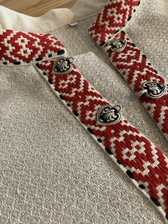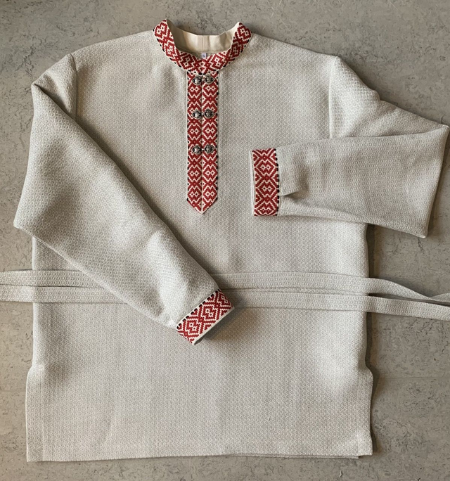 Karjalaishenkinen paita pellava-puuvillakankaasta. Kangas on kudottu Hämeenlinnassa Tekstiiliverstaalla ja se on kutistettu pesemällä kaksi kertaa. Koristenauha on kudottu käsin ja kuviolangan materiaali on puuvilla, myös se on kutistettu. Paitoja saatavilla XXS - XXXXL -kokoisina joko tinaisilla sydänsoljilla tai pronssisilla suomalaisilla soljilla, jotka on valmistanut MYK Jewel. Pesu käsin tai 40-60 asteen hienopesussa nurin käännettynä. Höyrytys tai silitys kosteana kolmen pisteen lämmöllä. Pesussa pellavasta voi tarttua nöyhtää muuhun pyykkiin. Mittataulukko ja mittausohjeet löytyvät viimeisistä kuvista ja mikäli johonkin mittaan tarvitaan muutoksia, miulle voi lähettää viestin sähköpostilla hannele.rusila@hannelerusila.fi tai soittaa puh. 0456390946.